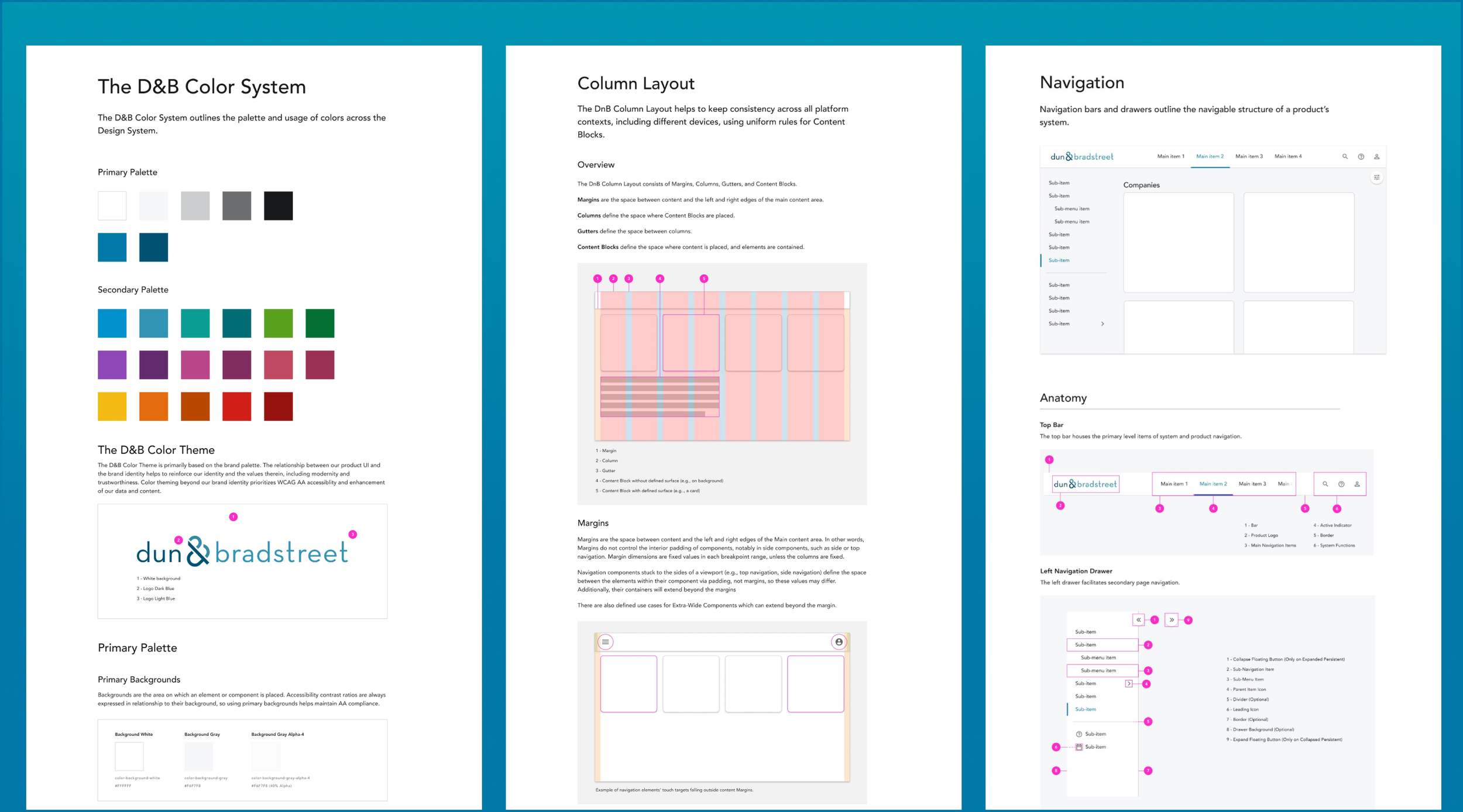 The unified D&B Design System was composed of roughly 50 components and standards ranging from foundational (e.g., Color, Layout) to complex (e.g., Navigation).